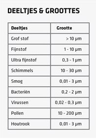 Om beter een beeld te krijgen waarop er dan juist gefilterd wordt, geven we ook even aan waarmee de deeltjegrootte ongeveer overeenkomen: